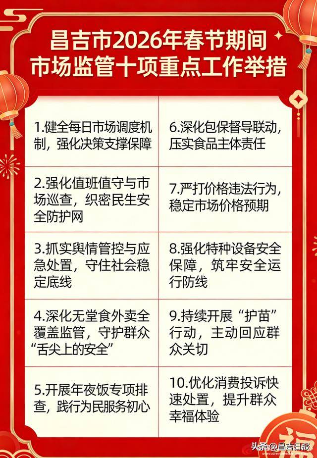 昌吉日报讯(全记者 报道)春节的脚步渐近,昌吉市的农贸市场、商超卖场里的年味渐浓,各族群众忙着购置年货。为守护新春消费平安,建牢节日市场防地,昌吉市市场监视办理局紧扣平易近生需求,聚焦群众消费痛点、难点,推出十项沉点工做行动,全员下沉一线开展节前市场监督工做,以严监管、暖办事为全市人平易近欢度新春保驾护航,让年味更浓,更暖。